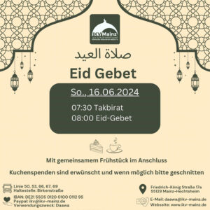 Das Eid-Gebet findet in der IKV-Moschee um 08:00 Uhr statt. Anschließend gibt es ein gemeinsames Frühstücke und eine kleine Feier.